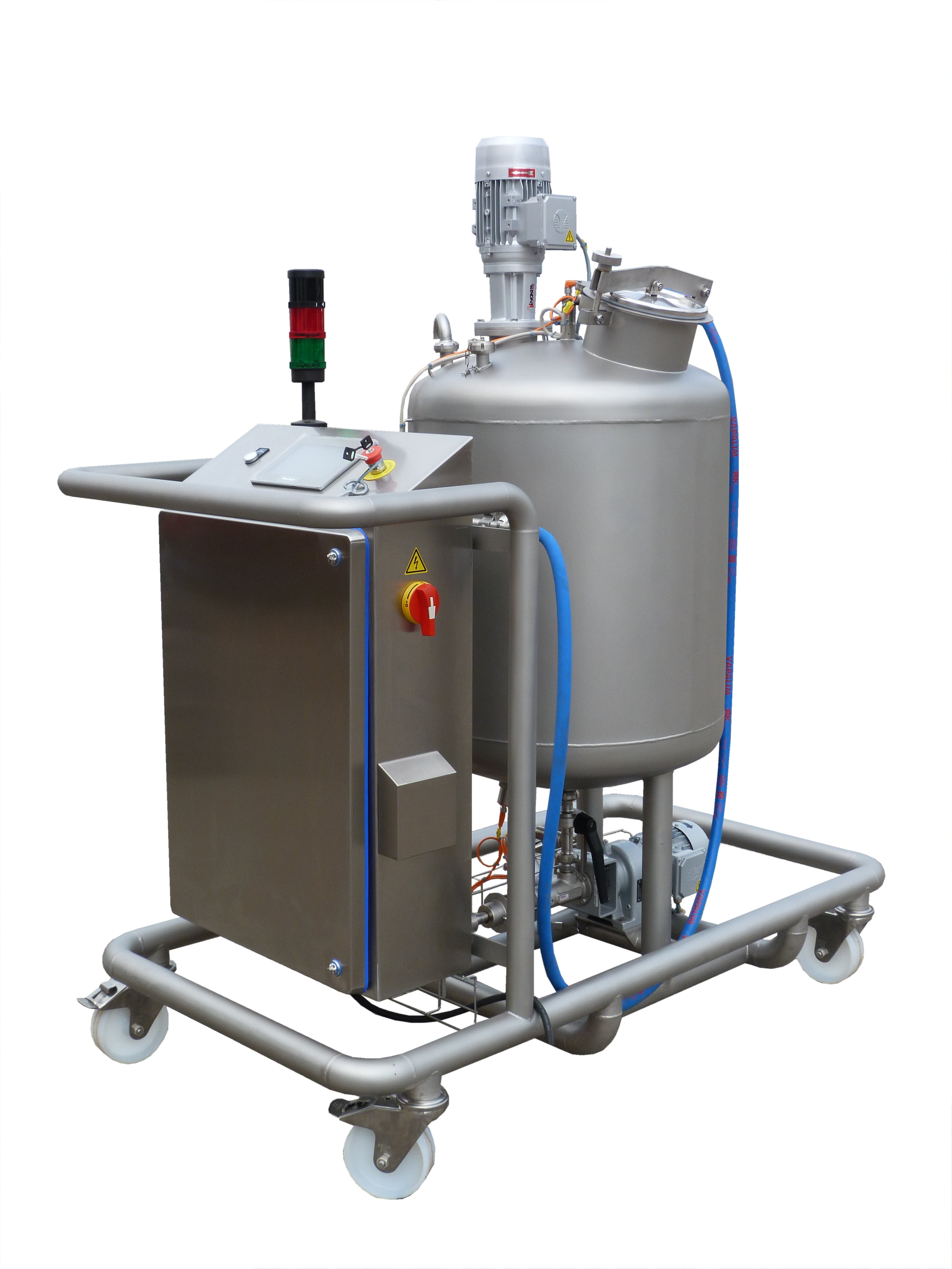 La cuve de préparation est équipée d’un agitateur tripale axial. Cet ensemble permet de conserver parfaitement homogène le mélange ou la solution liquide.